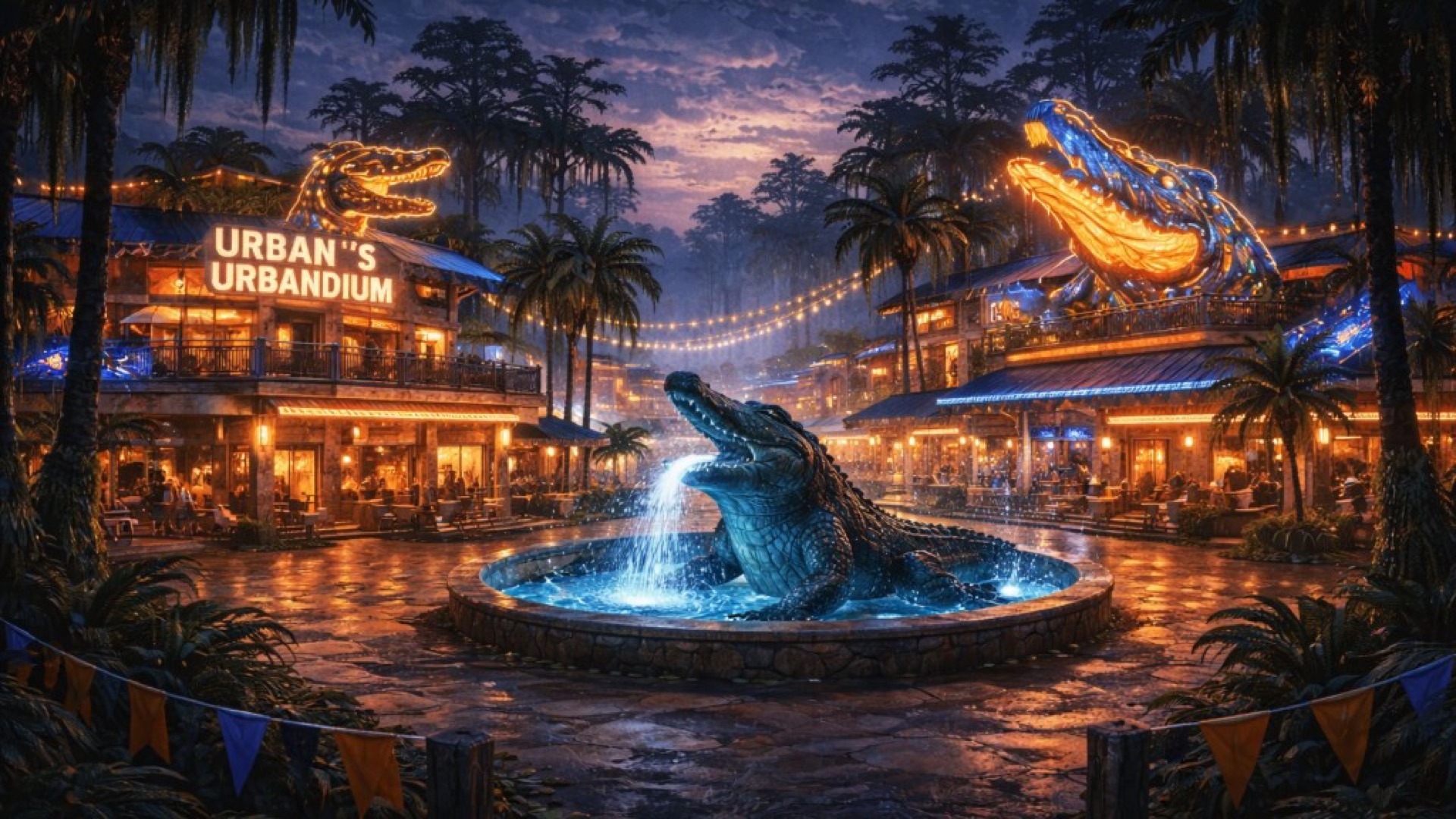 Buildings alternating between "modern Miami" and "shitty swamp." Urban's Urbanium (bar with the statue). Cultural dominance when Gators are winning. The gator chomp—becoming a compulsion for long-time residents.